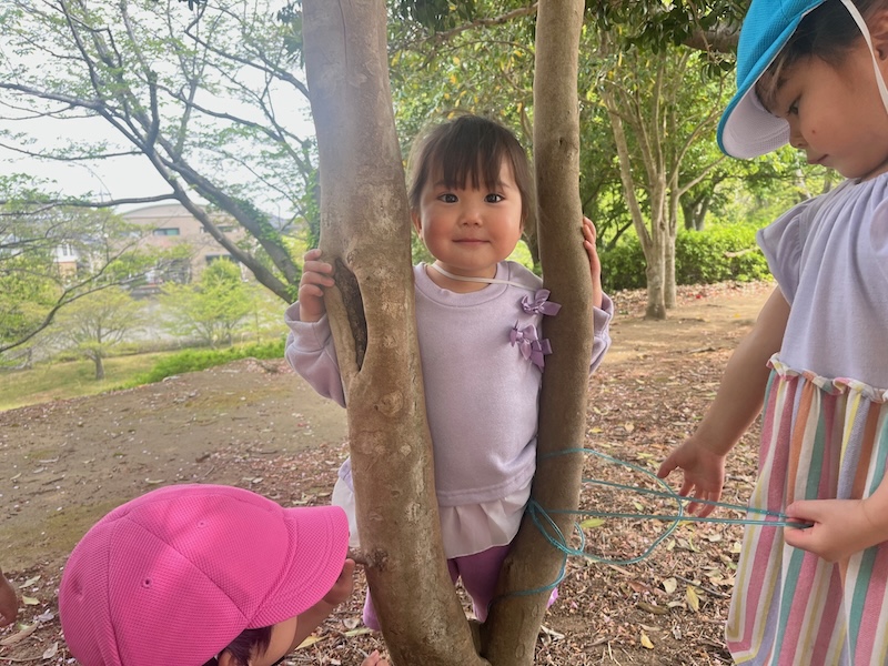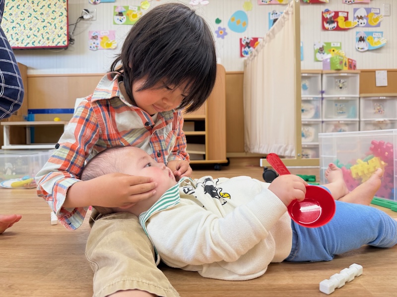 当園では歳の違う子たちみんなが同じ空間で過ごす「混合自由保育」を実施しています。大きい子供は自然と小さい子供の面倒をみるようになり、逆に小さい子は大きい子の行動を真似たりすることで成長していきます。現在は一人っ子の家庭も多いので、異年齢の子とたくさんかかわりが持てるのはとても大きなメリットだと考えています。