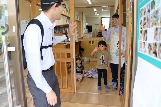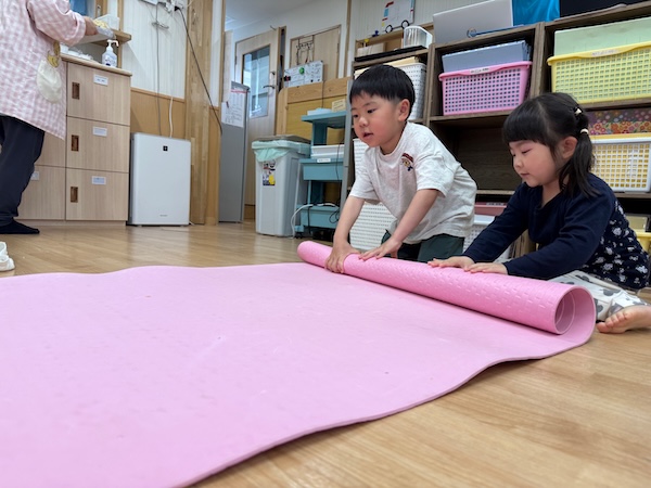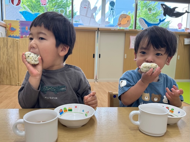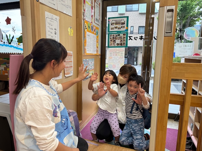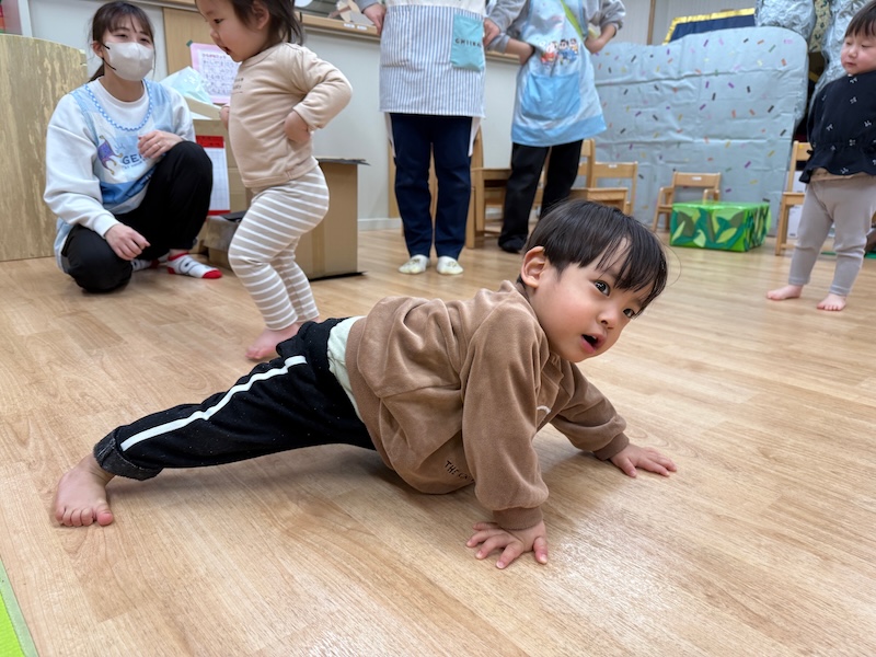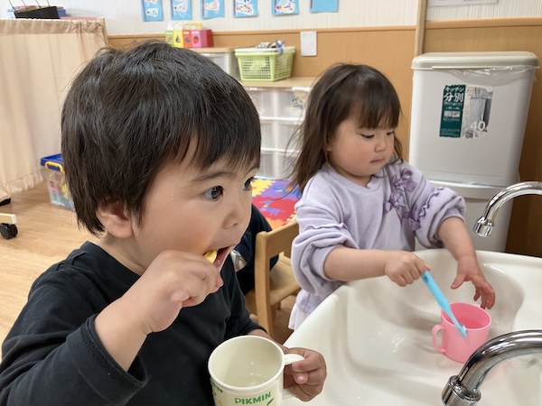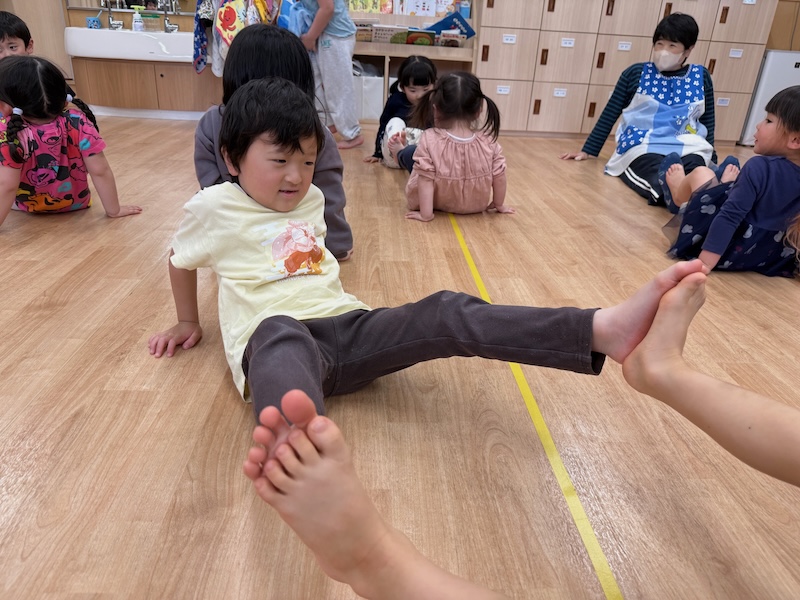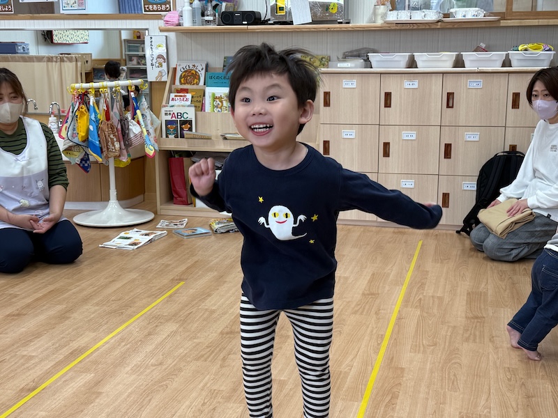 体操(補食あり)、トイレ、排泄、オムツ交換。当園では朝の挨拶の時に英語での挨拶を取り入れています。日常的に習慣化することで英語に慣れ親しめる環境を提供し、子どもたちも自然と英単語を理解し覚えて行きます。