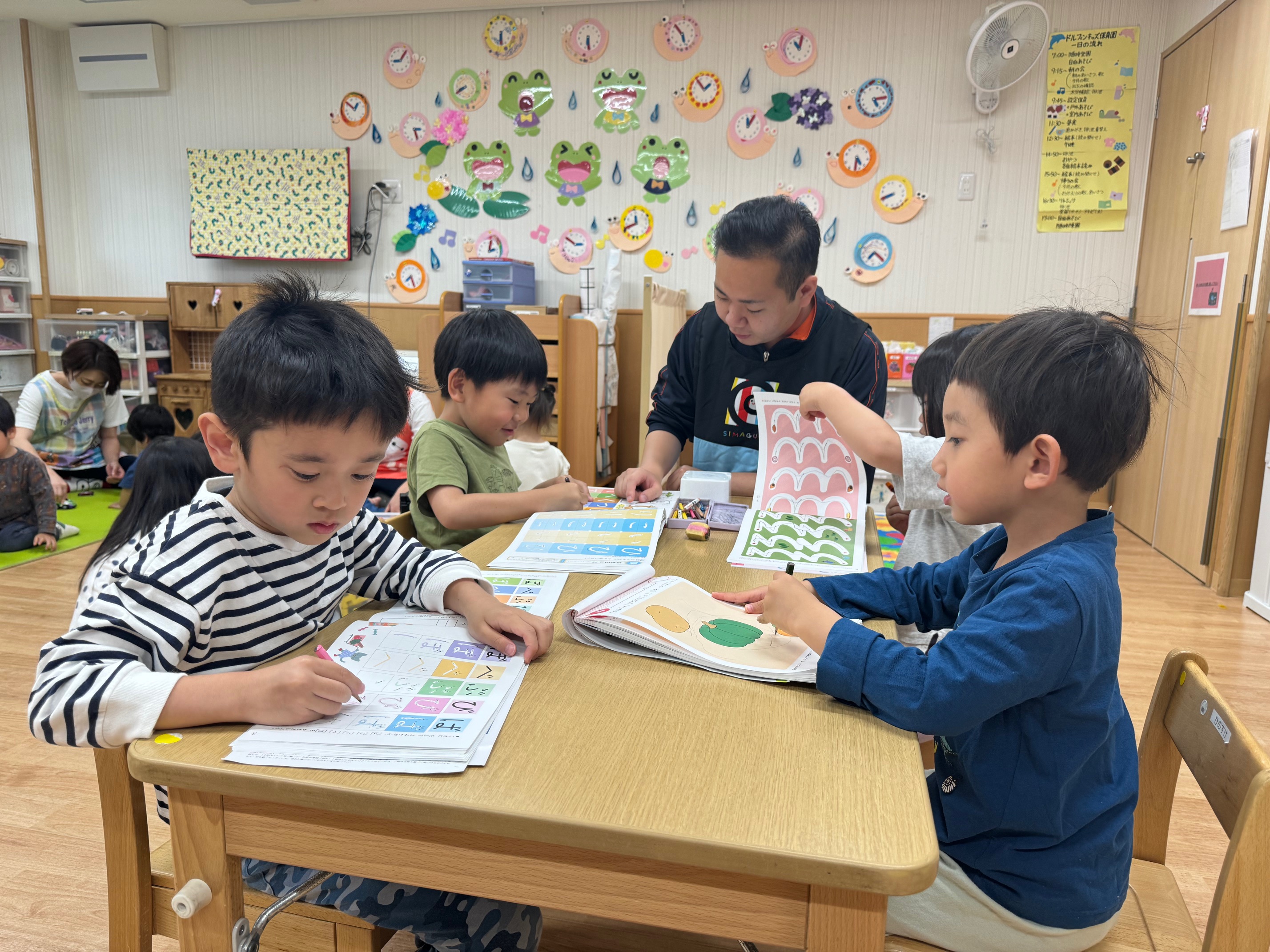 当園では、毎週月曜日と木曜日の16:30~17:00まで3歳児以上のお子様を対象に学習時間を設けています。対象のお子様はドリルやノート等、学習できる物をお持ち下さい。